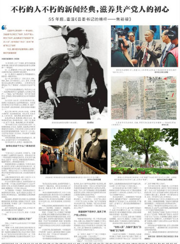 在《縣委書記的榜樣——焦裕祿》的結(jié)尾,作者深情地寫下:“你沒有死,你將永遠活在千萬人的心里!”今天,我們重溫這篇報道,令人心懷激蕩的是,你不僅活在千萬人的心里,更將持續(xù)激勵千萬人以無比的熱情奮斗新的征程。(特約評論員霍弗)