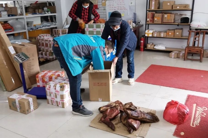 2月1日上午,程玉琳來(lái)到臨近的中和村交郵公共服務(wù)配送站,領(lǐng)取子女從廣東珠海寄來(lái)的特色年貨?!敖衲辏⒆恿粼诠ぷ鞯剡^(guò)年,提前給家里寄了點(diǎn)年貨。這才兩天,年貨就到了?!蹦玫桨?,程玉琳十分高興。
