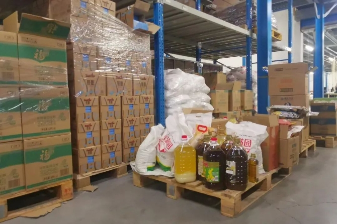 蘇寧通州物流配送中心倉(cāng)庫(kù)擺滿各種年貨。