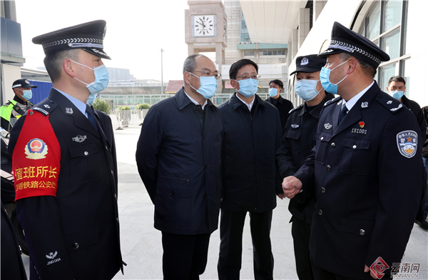 昆明火車站北廣場熙來攘往,秩序井然。阮成發(fā)、王予波看望執(zhí)勤的武警戰(zhàn)士和公安聯(lián)勤民警,衷心感謝大家長期以來為云南經(jīng)濟社會發(fā)展作出的重要貢獻(xiàn),希望同志們發(fā)揚連續(xù)作戰(zhàn)的精神,全力保衛(wèi)人民生命財產(chǎn)安全、保衛(wèi)全省社會大局穩(wěn)定。在聽取公安聯(lián)勤值守備戰(zhàn)情況匯報后,阮成發(fā)指出,要建立完善機制,實現(xiàn)鐵路公安、屬地公安信息共享,統(tǒng)一指揮。