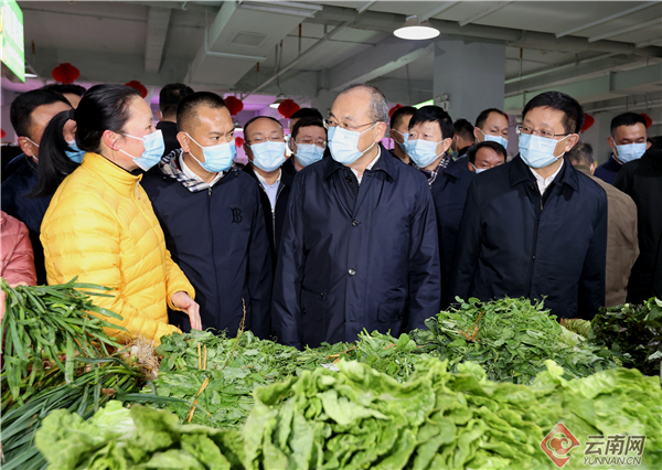 阮成發(fā)、王予波走進西山區(qū)未名城農(nóng)貿(mào)市場,與商戶交談,詢問肉價、菜價、進貨渠道、攤位費等,要求市場管理部門、市場經(jīng)營者采取有力措施,確保節(jié)日市場供應(yīng)貨足價穩(wěn)。