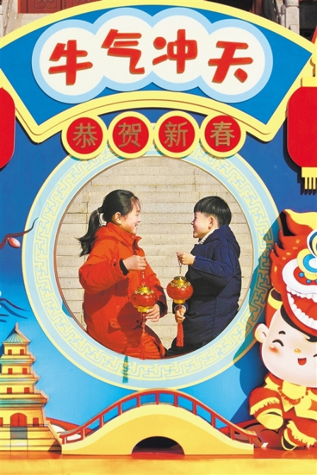 2月9日,江蘇省泰州市小朋友在望海樓前戲耍。古城泰州喜氣洋洋,年味十足。 湯德宏攝