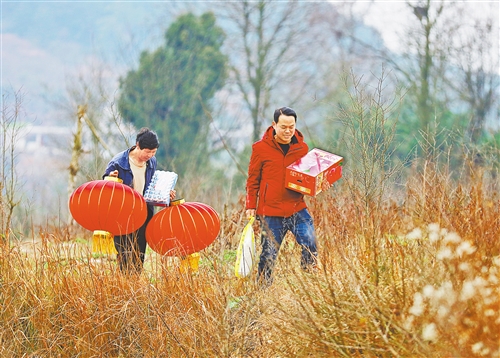 2月8日,湖南省雙峰縣井字鎮(zhèn)集市,兩名置辦年貨的村民背著中國結(jié)“?!弊中凶咴谌巳褐小@罱ㄐ聰z
