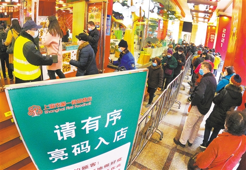 2月8日,位于上海市黃浦區(qū)的上海市第一食品商店,市民排隊(duì)“亮碼入店”購買年貨。 種 楠攝