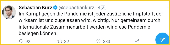 奧地利總理庫(kù)爾茨則在社交媒體上連發(fā)兩文。他表示,疫苗審批不應(yīng)有任何地緣政治禁忌。如果中國(guó)和俄羅斯的疫苗提交上市申請(qǐng),歐洲藥品管理局理應(yīng)進(jìn)行審核。