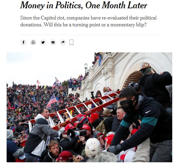 △《紐約時報》以《一個月后的金錢政治》為題發(fā)文質(zhì)疑:企業(yè)在沖擊國會事件后重新評估其政治捐款,這是一個轉(zhuǎn)折點還是一個短暫的波動?