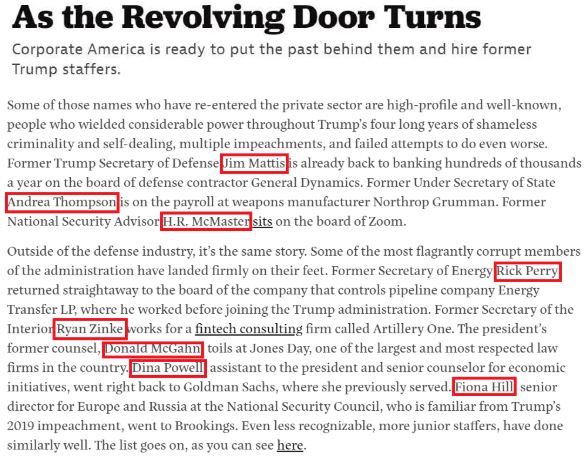 △《美國瞭望》雜志以《當旋轉(zhuǎn)門轉(zhuǎn)動時》為題發(fā)文,列出了長長的特朗普政府高官“再就業(yè)”名單。