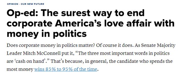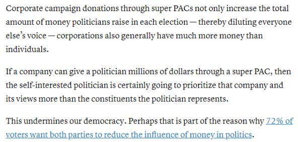 CNBC的文章指出,美國企業(yè)通過“超級政治行動委員會”(PACs)為政客們增加了每次選舉中籌集的資金總額,從而稀釋了其他人的聲音。如果一個公司可以通過PACs給一個政客數(shù)百萬美元,那么這個自私自利的政客肯定會優(yōu)先考慮這家公司和它的觀點,而不是政客所代表的選民的觀點?!斑@破壞了我們的民主,也許這就是為什么72%的選民都希望兩黨減少金錢對政治的影響”。