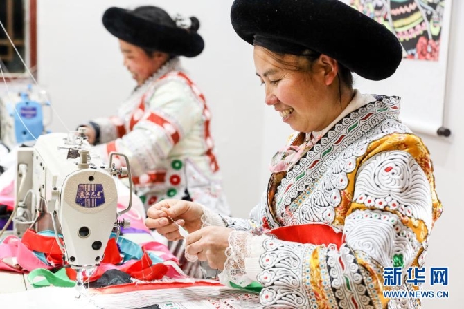 貴州畢節(jié)市黔西縣新仁苗族鄉(xiāng)化屋村村民在扶貧車間內(nèi)加工衣服(2月3日攝)。新華社記者 歐東衢 攝