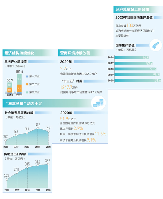從2016年至2018年經(jīng)濟(jì)總量相繼突破70萬(wàn)億元、80萬(wàn)億元、90萬(wàn)億元大關(guān),再到2020年我國(guó)成為全球唯一實(shí)現(xiàn)經(jīng)濟(jì)正增長(zhǎng)的主要經(jīng)濟(jì)體,國(guó)內(nèi)生產(chǎn)總值歷史上首次突破100萬(wàn)億元……“十三五”時(shí)期,國(guó)內(nèi)生產(chǎn)總值年均名義增量達(dá)到6.5萬(wàn)億元,比“十二五”時(shí)期增加1.0萬(wàn)億元,中國(guó)經(jīng)濟(jì)總量穩(wěn)居世界第二。2020年,我國(guó)人均GDP連續(xù)第二年超過(guò)1萬(wàn)美元,與高收入國(guó)家發(fā)展的差距繼續(xù)縮小。