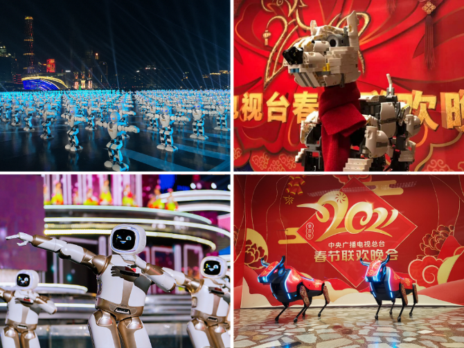 2月11日,在央視2021牛年春晚的舞臺上,優(yōu)必選科技全新研發(fā)的首款大型四足機器人化身“拓荒?!?,與劉德華、王一博、關(guān)曉彤等一起呈現(xiàn)了科技感十足的創(chuàng)意表演《牛起來》。它們以拼搏進取的深圳 “拓荒?!睘樵O(shè)計原形,融合祥云及中國紅等傳統(tǒng)文化元素,以絢麗的燈光及機械結(jié)構(gòu)詮釋科技美感,伴隨激昂的音樂奔騰向前。