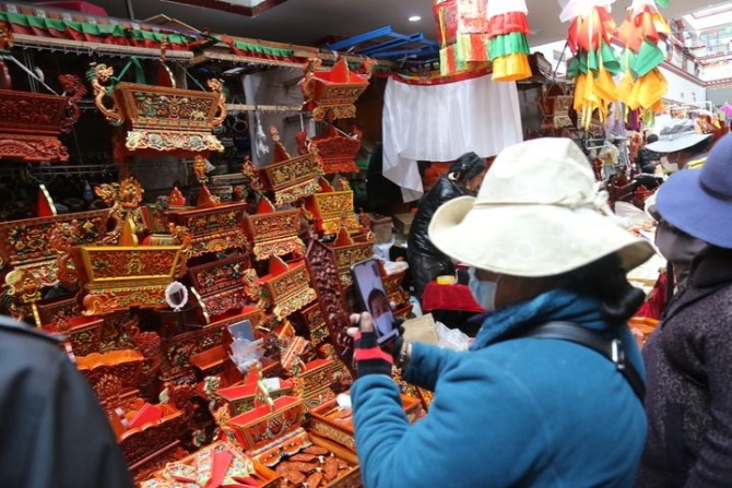 新年臨近,拉薩街頭采辦年貨的人群熙熙攘攘,大街小巷張燈結彩,古城街巷洋溢著濃濃的年味。布達拉宮前搭建起“歡度春節(jié)藏歷新年”吉祥裝飾,沖賽康市場和八廓商城等傳統(tǒng)年貨市場顧客盈門,人們互道:“洛薩扎西德勒(藏語:新年好)!”