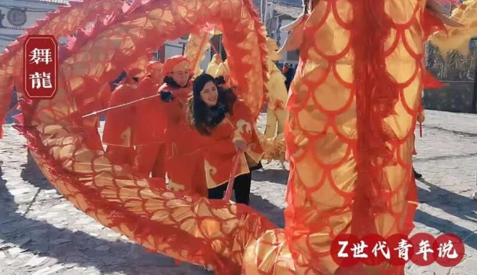 換上火紅的舞龍服,露西和雅娜合著鑼鼓聲與當?shù)卮迕褚黄饘埼璩鎏S的姿態(tài)。在翻飛跳躍的鼓點聲里,她們笑得格外開懷。