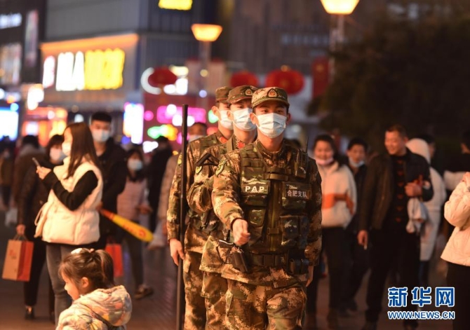 2月11日,武警安徽總隊(duì)合肥支隊(duì)執(zhí)勤十一中隊(duì)官兵在合肥淮河路步行街巡邏執(zhí)勤。新華社發(fā)(徐偉 攝)
