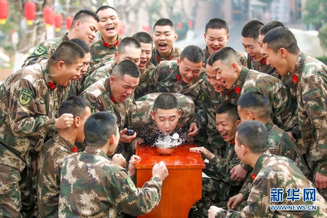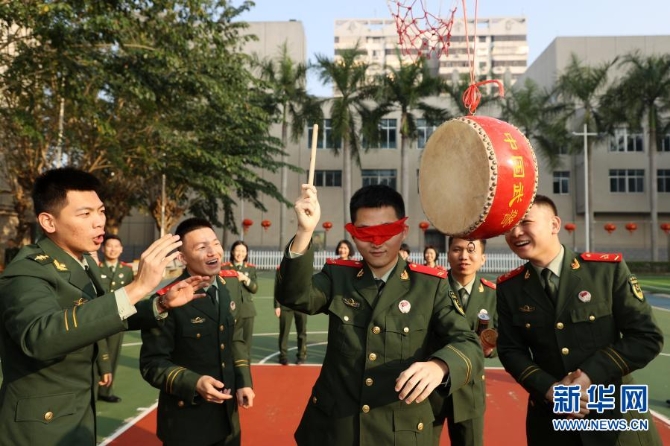 2月12日,武警海南總隊(duì)某部官兵在游園活動(dòng)中做游戲。新華社發(fā)(雷轍 攝)
