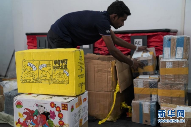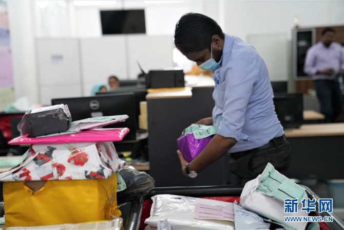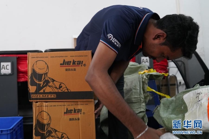 2月8日,斯里蘭卡科倫坡一家當(dāng)?shù)乜缇侈D(zhuǎn)運公司的雇員整理春節(jié)前從中國收到的一批貨物。新華社 記者唐璐/攝