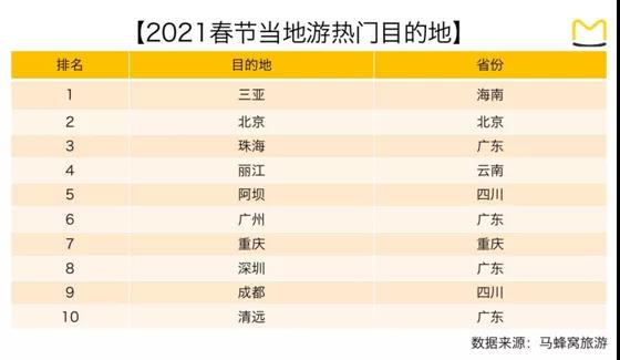 2021年,在各地“就地過(guò)年”的倡議之下,很多年輕人選擇留在城市渡過(guò)春節(jié)假期。當(dāng)?shù)赜?、周邊游成為人們?cè)诖汗?jié)假期出行的熱門之選。馬蜂窩旅游大數(shù)據(jù)顯示,春節(jié)假期期間,當(dāng)?shù)赜螣岫扰琶笆某鞘惺?三亞、北京、珠海、麗江、廣州、重慶、深圳、成都和清遠(yuǎn)。