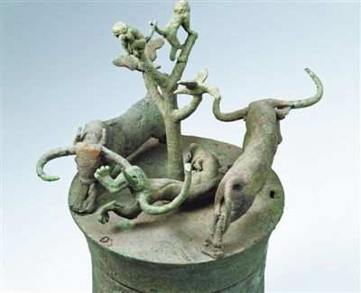 晉寧石寨山出土的一件西漢時期的“動物搏斗銅貯貝器”上,則出現(xiàn)了激烈的“虎牛搏斗”場景。該器為虎耳束腰筒形,下方四虎爪為器足。器蓋中立一株無葉之樹,樹枝上有兩猴、兩鳥,樹下是二牛一虎的驚魂搏斗。一虎繞樹奔跑,左后腿被一牛的巨角挑穿,虎僅前爪著地,后腿騰空。顯然,獸中之王與二牛搏斗中處在了下風(fēng)。樹上一猴抱樹瑟縮,另一猴四顧欲逃,兩只飛鳥在殘酷殺氣的催逼下,欲振翅逃離……動物搏斗的場面被工匠用戲劇化的場面瞬間定格。