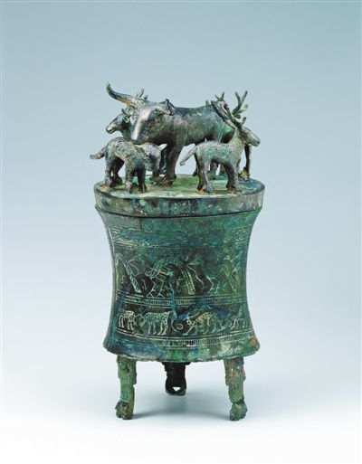 貯貝器是滇國用來貯藏海貝的青銅容器,類似于今天兒童的“攢錢罐”,其中貯藏的海貝是來自異域的珍品,在特定的社會環(huán)境中充當(dāng)了滇國的“特殊等價物”,起著貨幣作用。貯貝器上最常見的裝飾圖像就是牛。