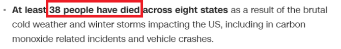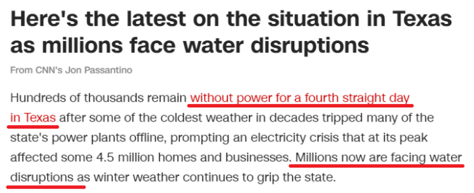 據美國有線電視新聞網(CNN)報道,截至當地時間2月18日,冬季風暴已造成全美至少38人死亡,數百萬家庭和商戶遭遇持續(xù)停電,水和燃料供應也受到很大影響。在受災最嚴重的得克薩斯州,數十萬民眾已經連續(xù)四天斷電。