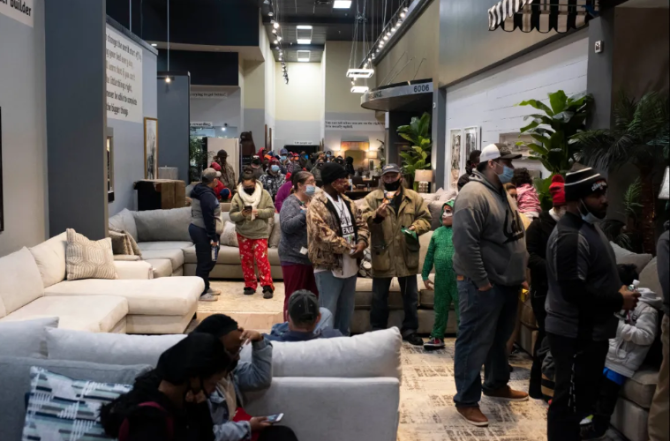 △當地時間2月17日,因遭遇停水停電,得克薩斯州民眾在家具店排隊等待領取食物。