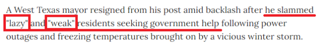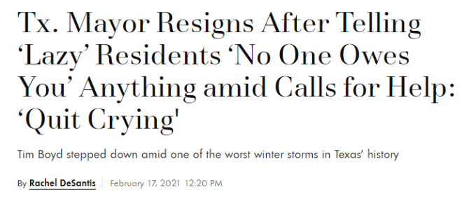 然而,該市市長蒂姆·博伊德2月16日卻在社交媒體發(fā)文將政府的責任推卸得一干二凈,并攻擊部分民眾“又懶又弱”。