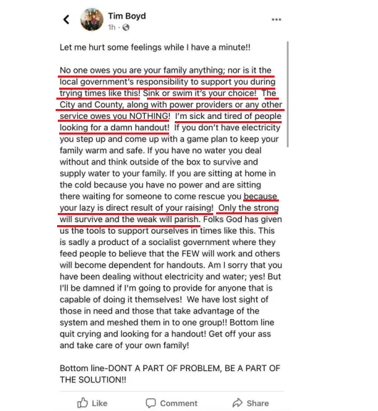 博伊德在社交媒體上說:“我們不欠你和你的家庭什么,當地政府的責任不是在這種困難的時候給你們提供幫助!生存還是死亡是你們自己的選擇!政府和電力供應商以及其他服務供應商并不欠你們什么!”