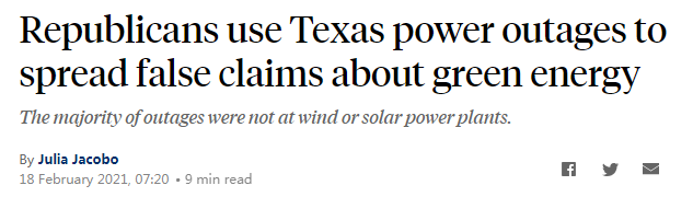 美國廣播公司(ABC)的報道則認為,共和黨政客們正利用得州大范圍停電來錯誤地指責可再生能源,但它們并不是罪魁禍首。