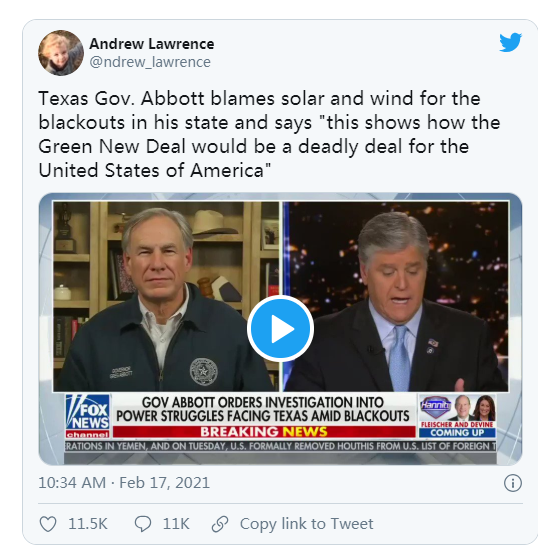得克薩斯州州長格雷格·阿博特在接受采訪時,把停電之鍋甩給了“綠色新政”。