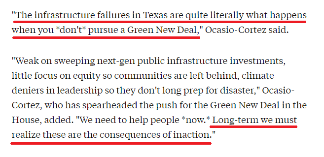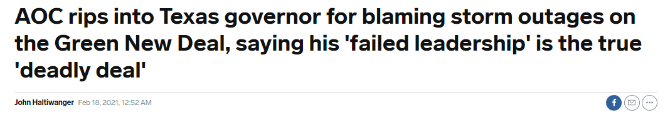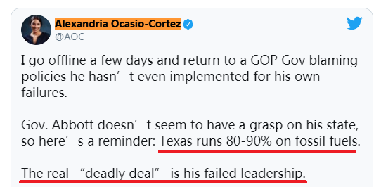 這一甩鍋行為馬上遭到了國會眾議員、有“推動綠色新政先鋒”之稱的亞歷山德里亞·奧卡西奧-科爾特斯的批評——“得州80%-90%的能源都來自化石燃料,真正的‘致命政策’是阿博特州長失敗的領導?!?/p>