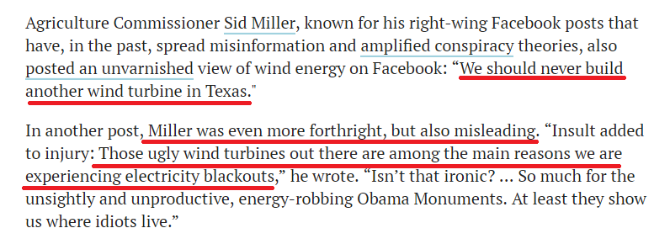 得州農業(yè)委員會委員席德·米勒也“毫不猶豫”地抓住這次機會詆毀風能,提出“我們永遠不應該在得州再建一座風力渦輪機”。他還在另一篇文章中發(fā)表更具誤導性的言論說,“那些丑陋的風力渦輪機是我們遭遇停電的主要原因之一”。