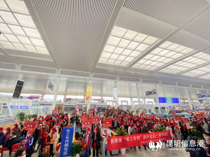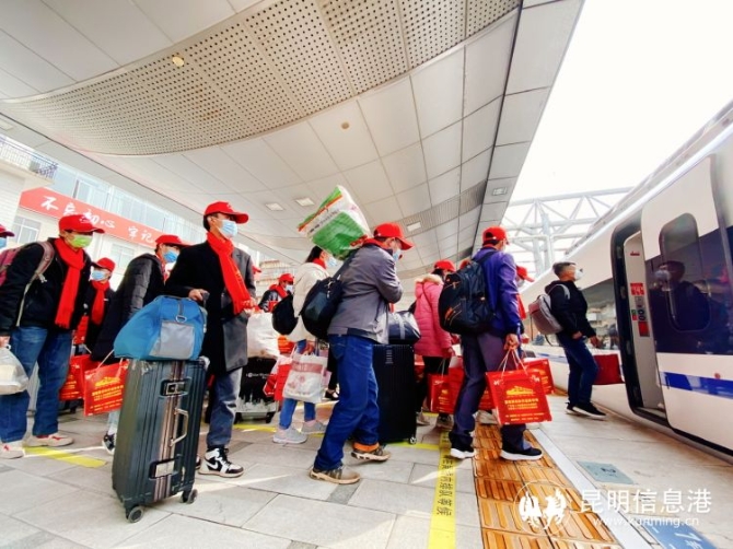 這是今年云南開行的首趟務(wù)工專列,務(wù)工人員頭頂紅色帽子、面戴防疫口罩、肩披紅色圍巾、手拎愛心禮包,在昆明南站工作人員引導(dǎo)下,通過(guò)出示健康碼、行程碼、體溫測(cè)量后有序進(jìn)站乘車。