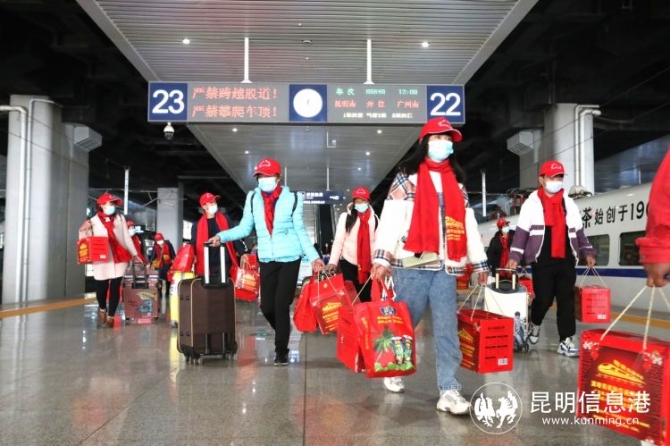 昆明信息港訊 記者上官艷君 為方便云南籍務(wù)工人員節(jié)后返崗,2月20日,中國(guó)鐵路昆明局集團(tuán)聯(lián)合地方政府開行昆明南至廣州南D3840次務(wù)工返崗專列,600名務(wù)工人員免費(fèi)乘坐返崗。