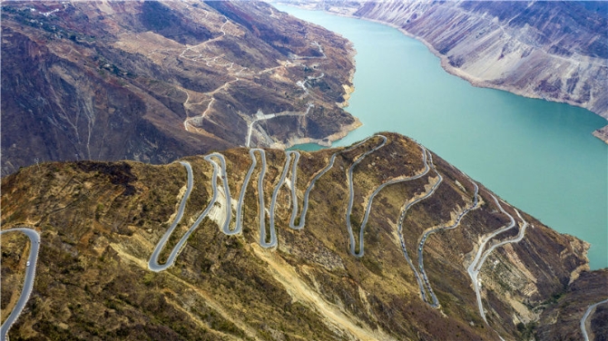 搬家車隊在開道警車的引領下從云南省永善縣大興鎮(zhèn)開往魯甸縣卯家灣易地扶貧安置區(qū)(2020年3月15日攝,無人機照片)。新華社記者江文耀攝