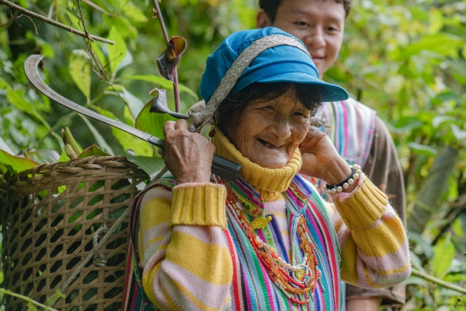 在云南省貢山獨龍族怒族自治縣獨龍江鄉(xiāng)孔當村,79歲的獨龍族老人孔當娜割完豬草準備下山(2020年10月31日攝)。新華社記者胡超攝