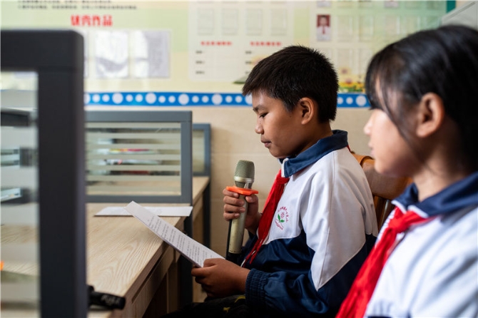 傈僳族學生楊天武(左)在云南省怒江傈僳族自治州瀘水市大興地鎮(zhèn)格力小學校園廣播站練習播音(2020年11月5日攝)。新華社記者胡超攝