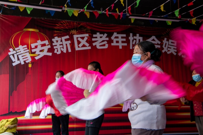 搬遷群眾在靖安新區(qū)老年協(xié)會娛樂中心跳舞(2021年2月3日攝)。新華社記者江文耀攝