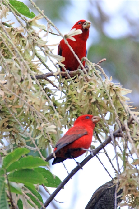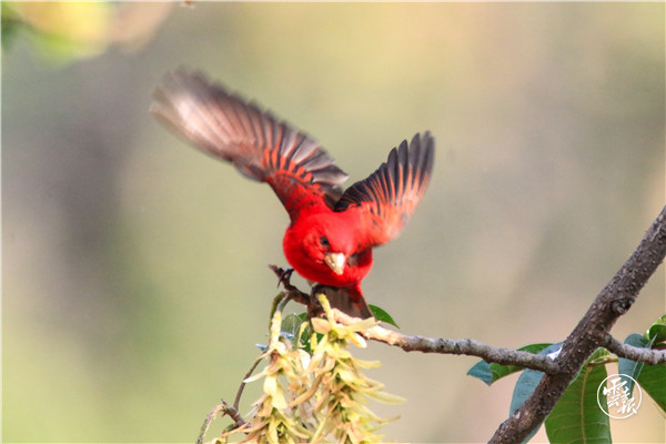 在黃杞樹(shù)上,三十只血雀藏匿在樹(shù)冠里覓食,聞其聲不見(jiàn)其影。樹(shù)枝忽而顫動(dòng),才能捕捉到血雀的身影。偶有大膽些的血雀,會(huì)站在枝頭上自由自在地喝水吃花、梳理羽毛。血雀三五成群的立在枝丫上,像極了一串紅燈籠,喜慶而吉祥。