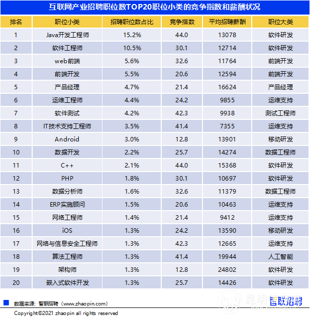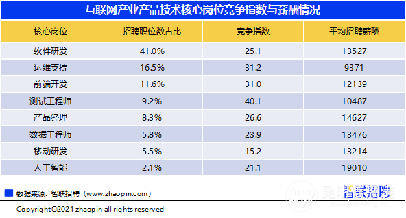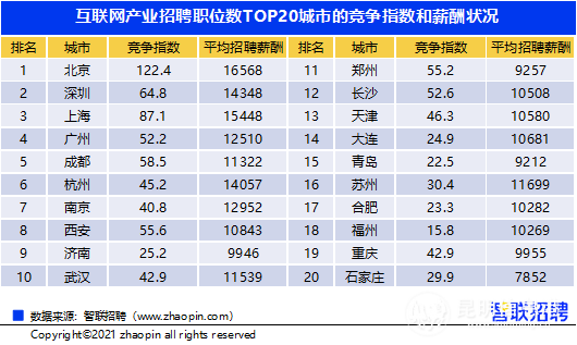 昆明信息港 記者江楓 智聯(lián)招聘根近日發(fā)布《2021年互聯(lián)網(wǎng)產(chǎn)業(yè)求職指南》,其中指出,互聯(lián)網(wǎng)招聘需求中技術(shù)崗位占2成,產(chǎn)品、設(shè)計(jì)崗競爭激烈;軟件研發(fā)人才需求最高,人工智能崗位高薪且處于競爭洼地;77%的人才需求集中在一線、新一線城市,北京、上海、深圳以高需求、高供給、高薪資成為三大熱門城市。