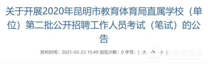 昆明信息港訊 記者上官艷君 2月23日,昆明市教育體育局發(fā)布“關(guān)于開展2020年昆明市教育體育局直屬學(xué)校(單位)第二批公開招聘工作人員考試(筆試)的公告”,2020年昆明市教育體育局直屬學(xué)校(單位)第二批公開招聘工作人員考試(筆試)將于2月28日開展。