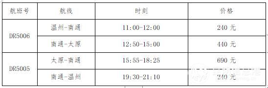 此外,瑞麗航空于21日繼續(xù)開通“溫州-南通-太原”航線,票價低至240元起,航班信息如下: