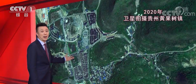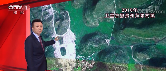 我們?cè)倏纯促F州安順市的黃果樹(shù)鎮(zhèn)。10年前,這里還只有一橫一豎兩條白色的縣鄉(xiāng)公路。10年后,公路變得密密麻麻。出山有了更多選擇。這條是滬昆高速,由西南到東北跨省而過(guò)。衛(wèi)星能看到的可不光是路。