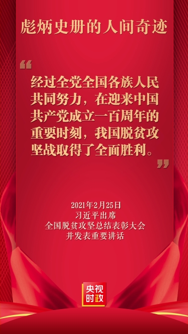 習(xí)近平莊嚴宣告,經(jīng)過全黨全國各族人民共同努力,在迎來中國共產(chǎn)黨成立一百周年的重要時刻,我國脫貧攻堅戰(zhàn)取得了全面勝利,現(xiàn)行標準下9899萬農(nóng)村貧困人口全部脫貧,832個貧困縣全部摘帽,12.8萬個貧困村全部出列,區(qū)域性整體貧困得到解決,完成了消除絕對貧困的艱巨任務(wù),創(chuàng)造了又一個彪炳史冊的人間奇跡!這是中國人民的偉大光榮,是中國共產(chǎn)黨的偉大光榮,是中華民族的偉大光榮!