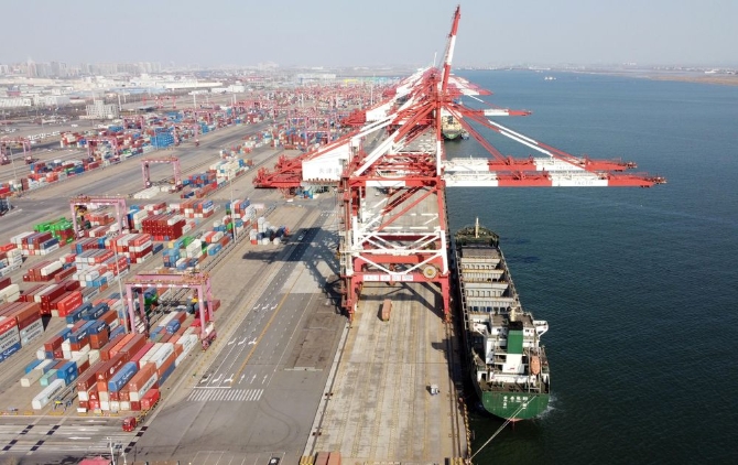 2月22日,從河北黃驊港駛來(lái)的寶安城89號(hào)貨輪??吭谔旖蚋勐?lián)盟國(guó)際集裝箱碼頭。(無(wú)人機(jī)照片)新華社記者趙子碩 攝
