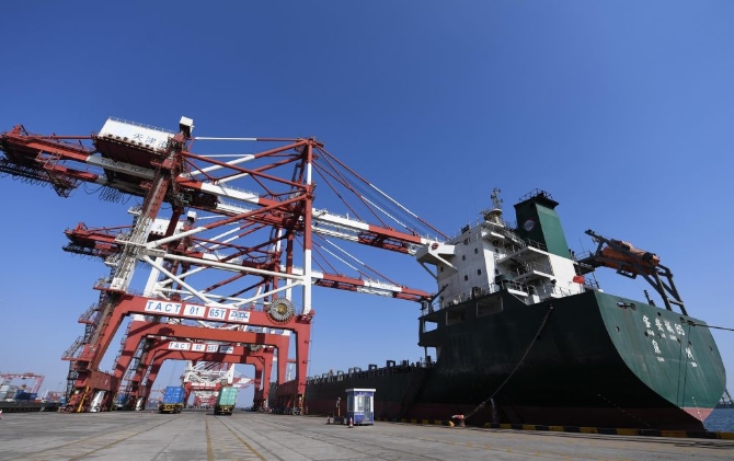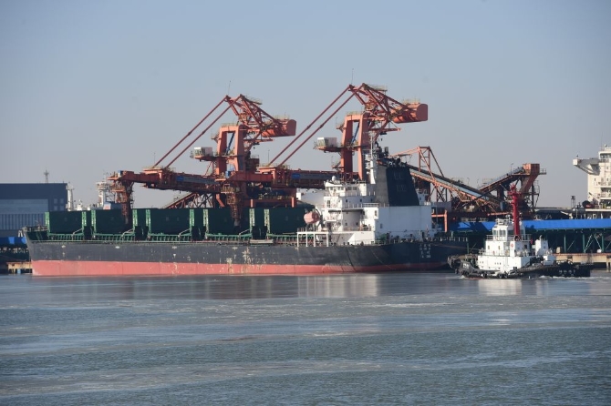 2月22日,從河北黃驊港駛來(lái)的寶安城89號(hào)貨輪停靠在天津港聯(lián)盟國(guó)際集裝箱碼頭。新華社記者趙子碩 攝
