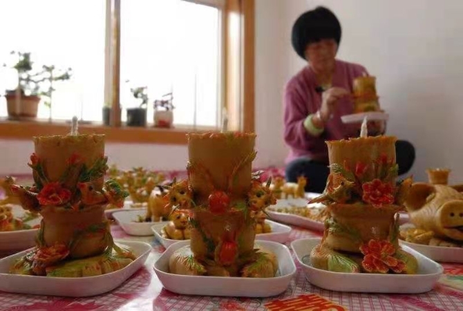 即墨區(qū)田橫鎮(zhèn)南蘆村村民展示剛制作好的豆面燈和面塑