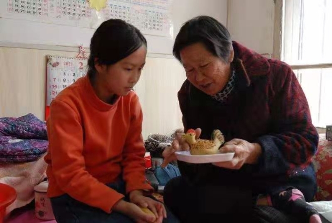 劉蓮花在指導(dǎo)外孫女制作豆面燈