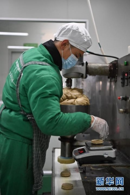 2月26日,在四川省阿壩縣托崗黑青稞生產(chǎn)車間內(nèi),工作人員檢測成型的黑青稞餅重量。 近年來,四川省阿壩藏族羌族自治州阿壩縣依托當?shù)靥厣Y源,致力于黑青稞食品研發(fā)及生產(chǎn),并將黑青稞餅作為學生的營養(yǎng)早餐,送進阿壩縣、紅原縣、若爾蓋縣等地的學校?! ⌒氯A社記者 胥冰潔攝