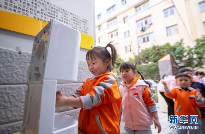 小朋友們?cè)谌雸@時(shí)排隊(duì)洗手消毒。