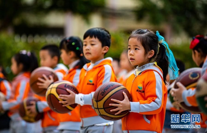 小朋友們?cè)趫@內(nèi)做運(yùn)動(dòng)。